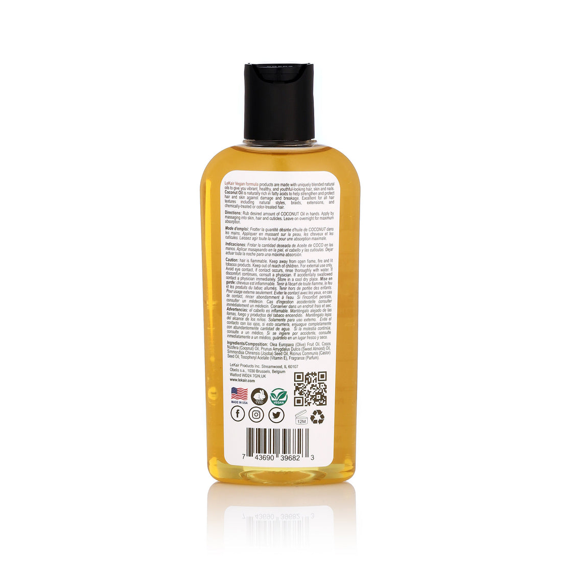 منتجات LeKair Vegan formula مصنوعة من زيوت طبيعية ممزوجة بشكل فريد لتمنحك شعرًا وبشرة وأظافرًا نابضة بالحياة وصحية وشبابية المظهر. زيت جوز الهند غني بشكل طبيعي بالأحماض الدهنية للمساعدة في تقوية وحماية الشعر والبشرة من التلف والتكسر. ممتاز لجميع أنواع الشعر بما في ذلك التسريحات الطبيعية والضفائر والوصلات والشعر المعالج كيميائيًا أو المصبوغ.
